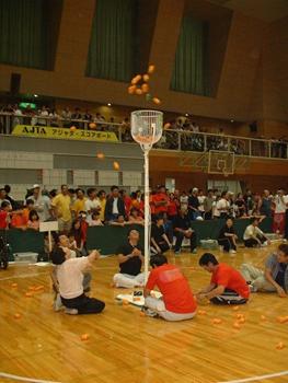 - スタートの合図と共に選手は方向を変え、準備したアジャタボールを一斉にバスケットに向かって投げ入れます。